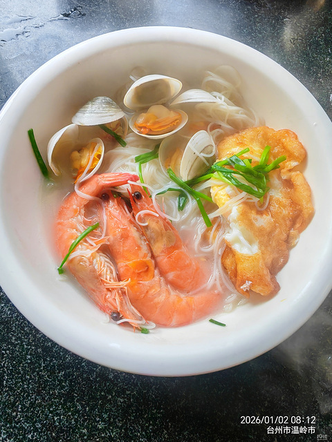 早上起来没什么胃口,但是饭要吃的呀,煮碗清水面,加个荷包蛋,再来几只虾,蛤蜊添点鲜,最后葱段来点亮色