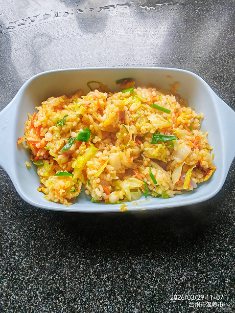 早上炒面剩下点,昨晚剩饭还蛮多,中午就炒炒吃了吧,锅里油热洋葱胡萝卜炒炒,再放入虾皮,包心菜翻炒,然后放年糕炒,年糕炒微软放米饭,加盐,生抽,最后放入早上的一点点炒面加鸡精葱花拌匀就可以了。小排玉米汤咕咕。