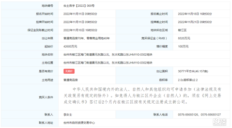 2022年11月21日9点,台州市椒江区海门街道景元东路以北、东太和路以东JHM110-0302地块将开始竞拍。地块挂牌起始价为42600万元,并以集中式商业综合体8000元/㎡、两层底商均价8200元/㎡回购面积之和不少于15000平方米、不大于15500平方米;以有产权100000元/个、无产权80000元/个回购地下机动车停车位108-112个,有产权和无产权车位比例不少于15%。该地块起