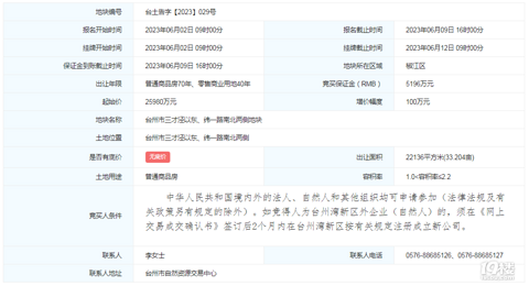 2023年6月12日9点,台州市三才泾以东、纬一路南北两侧商住出让项目将开始竞拍。地块挂牌起始价为25980万元,地块综合起始楼面地价为6104元/㎡(不考虑回购等因素)。其中, 地块一(城镇住宅)出让起始价为22285万元,地块二(零售商业、商务金融、旅馆用地)出让起始价为3695万元。 以15000元/平方米回购地块一40套住宅用房,套型面积为132平方米;以120000元/个回