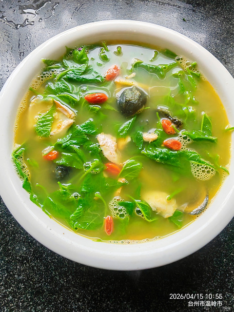 中午我摘的桑叶老了,烧出来口感略微差点,今天老妈掐了嫩尖,鲜甜嫩的猛,锅里油微热放入生姜丝大蒜片煎一下,再放入切块的一个咸鸭蛋一个皮蛋煎炒,再加入热水,煮开放入桑叶,加点盐,枸杞,煮两分钟放味精出锅,很好吃的,可以试试哦!