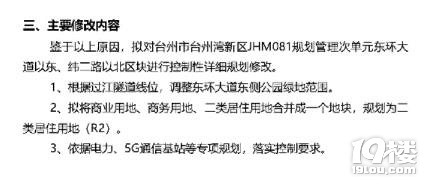 http://zrzy.zjtz.gov.cn/art/2023/7/26/art_1229044443_3883042.html 东环大道以东、纬二路以北区块控制性详细规划修改必要性公示 鉴于以上原因,拟对台州市台州湾新区JHM081规划管理次单元东环大道以东、纬二路以北区块进行控制性详细规划修改。1、根据过江隧道线位,调整东环大道东侧公园绿地范围。2、拟将商业用地、商用地、二类居住用地合并成一
