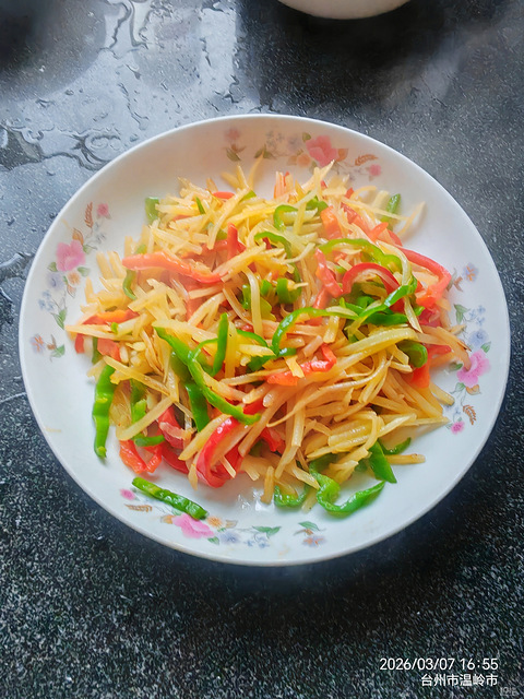 土豆丝焯水,锅里油热放土豆丝煸炒,加盐,放入青红椒,放点生抽,鸡精,炒匀就可以出锅了。简单又好吃哦!