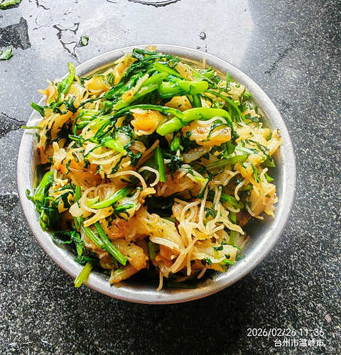 门口剪的茼蒿,洗干净,切段,锅里油热放大蒜根,虾皮,煎一下,放米面炒炒,再放入年糕炒,年糕米面差不多好了,加盐生抽大蒜叶子炒匀,刚茼蒿炒熟,加鸡精拌匀,很好吃的