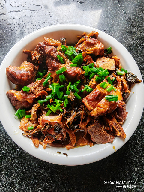 忽然想吃梅干菜,炖点梅干菜排骨,排骨洗干净加葱姜料酒焯水,捞出来再洗干净,锅里油热放葱姜排骨煸炒,然后倒入泡好的梅干菜炒香放冰糖,生抽老抽,一圈老酒,翻炒一下加入热水,煮开放高压锅炖煮,出锅撒葱花。