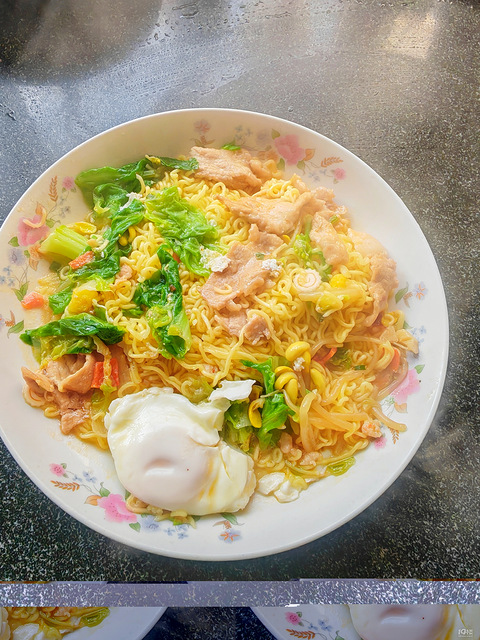 水煮肉片煮太多了,煮方便面的时候加了些,锅里水开关火,打入一个鸡蛋,盖盖闷两分钟再开火,煮开放方便面饼,蔬菜包,再次煮开放青菜,水煮肉片放几片,再次煮开就可以了
