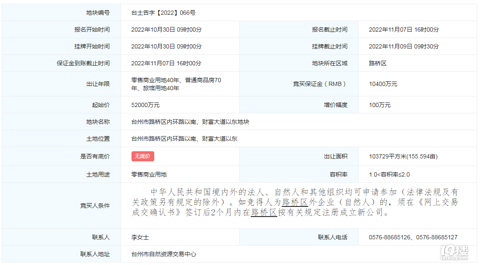 2022年11月9日9点30分,台州市路桥区内环路以南、财富大道以东地块将开始竞拍。地块挂牌起始价为52000万元。该地块起始楼面价2507元/平方米(不考虑回购等因素)。出让基本信息 地块位于路桥区内环路以南、财富大道以东,规划出让面积103729平方米(155.594亩),为住宅、商业、酒店用地。其中,商业建筑面积达15万方多(包含酒店2万方),意味着未来路桥飞龙湖版块将新添综合体一个。规划
