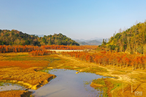 年年岁岁把红杉林赞叹。一路行来,顷情观览,无论山腰水湾、旱地湿滩,那一片片仿佛被季节醉酡了的红杉,所到之处让人流连忘返。观赏红杉林在于秋冬,远看那一片绚丽如火显得引人注目。近看红色、橙色、未褪的绿色,界在绿色和红色间的粉红、橙黄等,斑斓得就像仙女脱手了的色盘。俯看,一棵棵风中摇曳的红杉,像是一只只荡漾开的花伞。林间,层层堆积的落叶,似羽纷飘编织的红毯。乘阳光灿灿时,撩几片叶,踩几片滩,留下秋冬的一