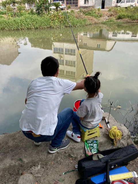 本来以为爸爸爱钓鱼,姐姐不喜欢,没想到,迷一样的热爱姐姐作业做好了,非要去找爸爸,然后一家四口小河边集合姐姐还真有天赋,会自己上鱼饵,不一会真的钓起来了,信心大增,更不愿意回家了老二是打酱油,爸爸打了一桶水,他在旁边喂鱼喝水,吃各种各样的青草蚊子太多,受不了,留下他们三人组在这里喂蚊子