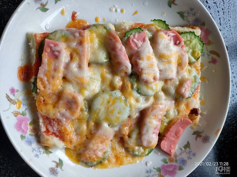 最简易版的披萨,吐司切掉边边,涂一层番茄酱,放上洋葱圈撒一层芝士,再摆黄瓜火腿肠再厚厚撒一层芝士,微波炉四分钟,哇⊙?⊙!可以吃了哦!