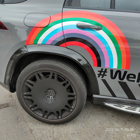 大奔,这个彩虹很亮眼,远远看到了,这个车轱辘上的大R是原装的吗?