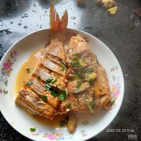 自制美食名称:香煎金线鱼需要的材料:金线鱼难易指数:3星。(5星:非常难4星:有点难3星:一般2星:简单1星:手残党都会)制作注意点:煎鱼的时候热锅凉油,刚开始煎的时候不要翻动。弟弟买了一条金线鱼,我是第一次见,然后抖音搜做法,一般都是香煎鱼洗干净,我这条太大了,切两段,锅不够大哈!热锅凉油,放入金线鱼,中火煎三五分钟后可以翻面了这是翻面了,基本上没破皮哦!两面金黄了,加入姜片,盐加葱段 老酒,白