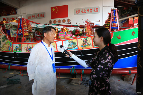 椒江葭止的送大暑船是国家级非物质文化遗产,起源于清同治年间,每年农历七月大暑日举行,旨在祈求风调雨顺、驱除病疫。大暑船由匠人耗时数月手工制作,船体装饰米糕、苹果等供品,象征丰收与祈福。图一 央视采访,余图为葭止五圣庙内的大暑船。