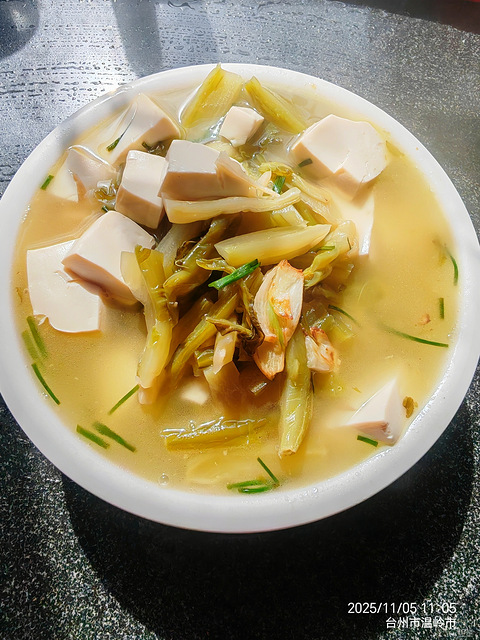 为什么不说千里飘香,因为这个不臭,清味带点酸,菜蒂头洗干净切小条,锅里放猪油,放大蒜片煎一下,倒入菜蒂头翻炒,然后加点白糖,放豆腐,加热水,煮开再中小火煮五分钟,撒葱段,出锅
